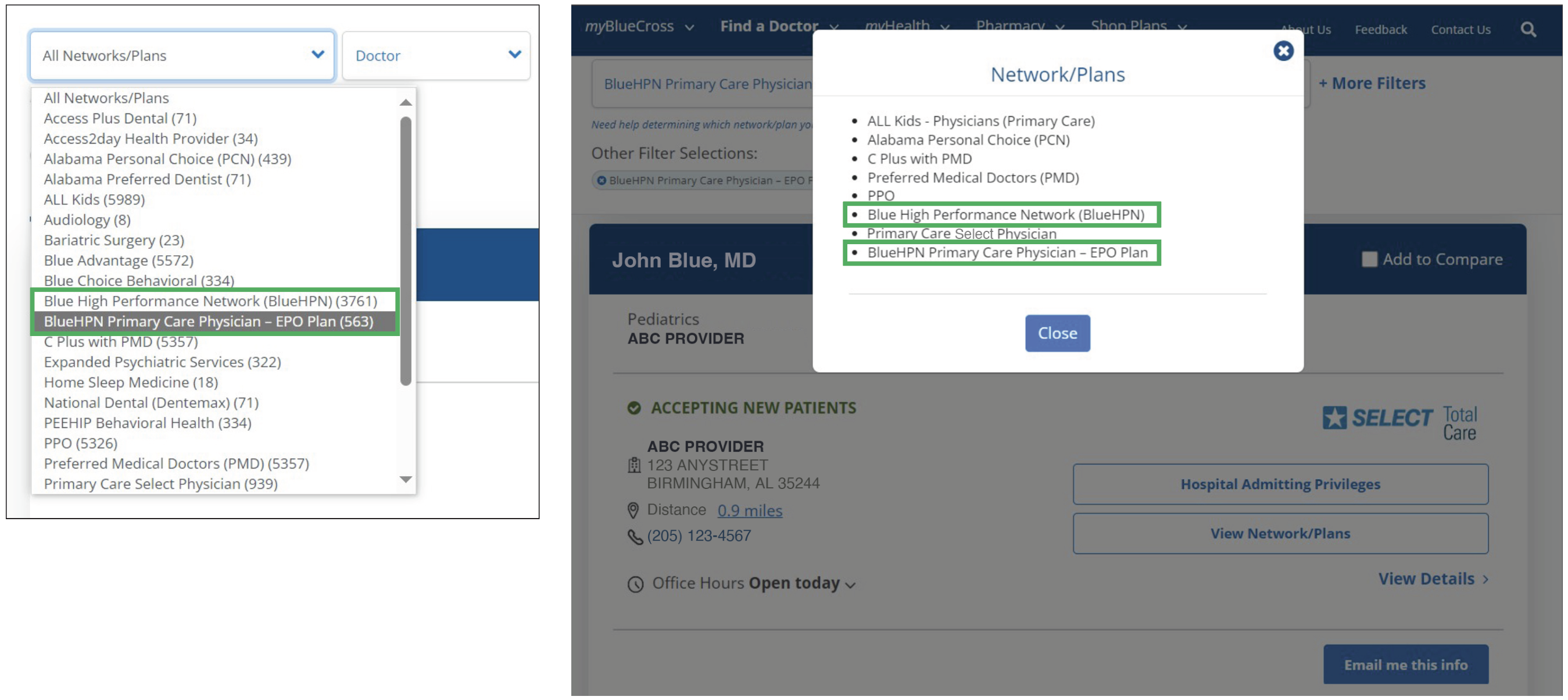 To check the BlueHPN status of a specific provider, use our Find a Doctor tool (see below) by selecting one of the following from the “All Networks/Plans” drop-down menu: