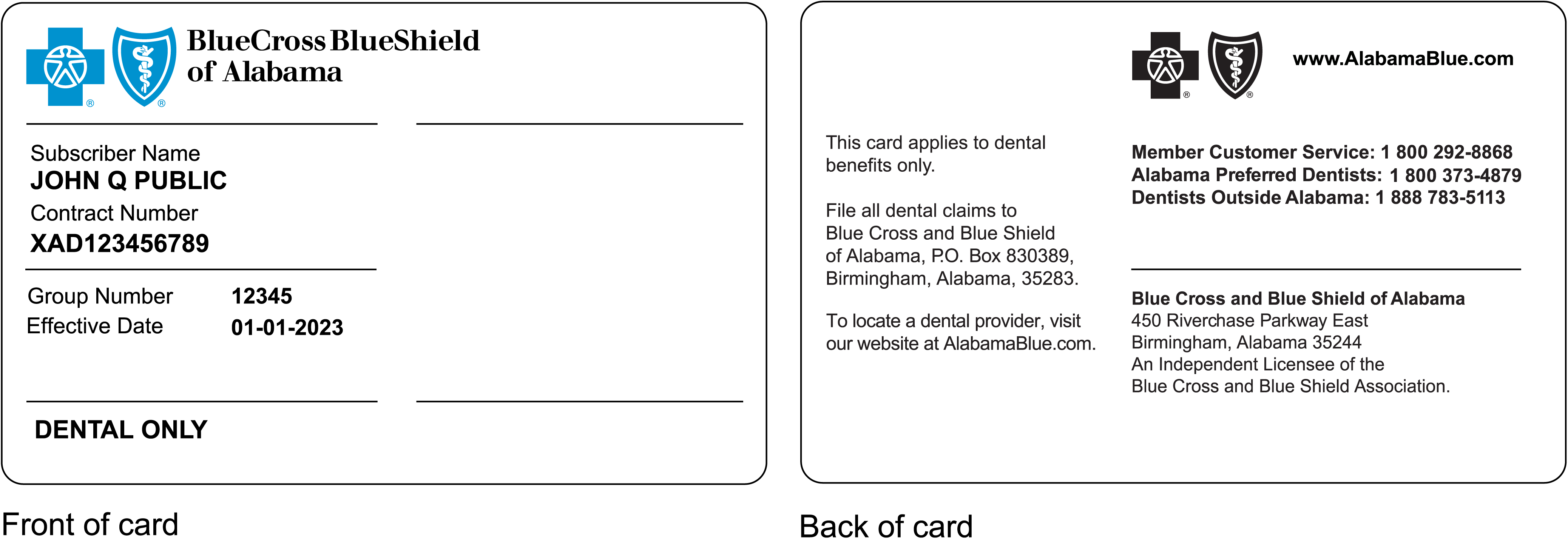Always check Eligibility and Benefits at each patient visit. If a member has dental coverage, the word “DENTAL” may appear on the identification card. Contracts with an XAD prefix denote a dental contract only. Contracts with other prefixes may also include dental coverage; therefore, always include the prefix along with the number when filing claims.